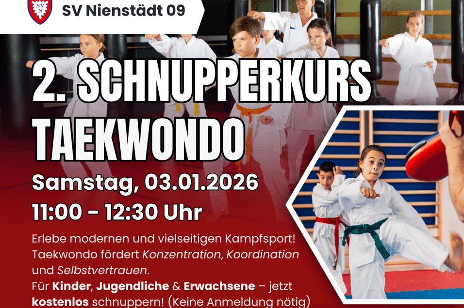 Am Samstag, den 03.01.2026, lädt der SV Nienstädt 09 alle Kinder, Jugendlichen und Erwachsenen herzlich zum 2. offenen Taekwondo-Schnupperkurs ein. Von 11:00 bis 12:30 Uhr kannst du in der Turnhalle Nienstädt die koreanische Kampfsportart hautnah erleben – völlig kostenlos und ohne Anmeldung.