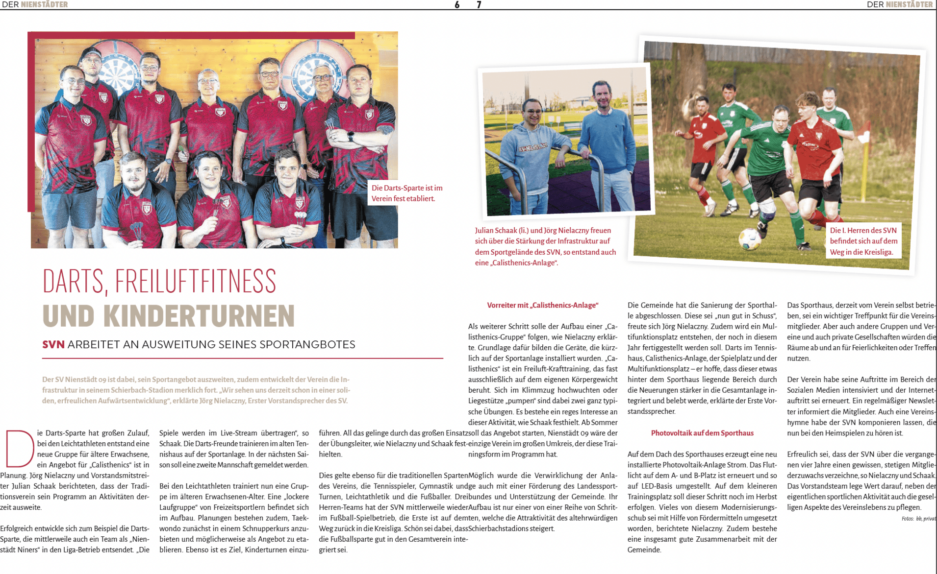 Im "Nienstädter" des Schaumburger Wochenblatts gab es einen ausführlichen Bericht über die Entwicklung unseres Vereins. Von Darts über Outdoor-Fitness bis hin zum Kinderturnen – beim SV Nienstädt 09 tut sich richtig was!