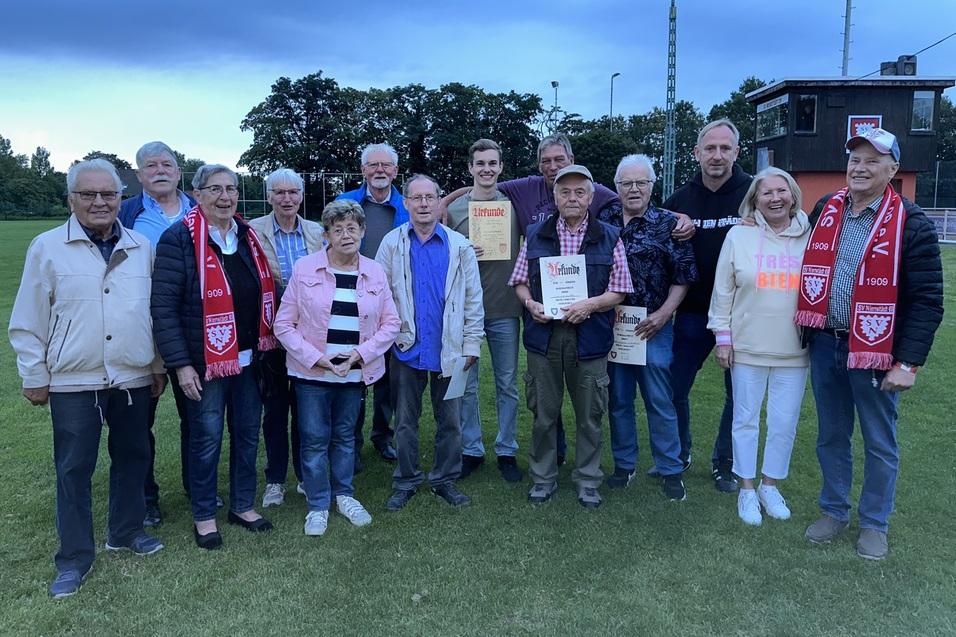 Dabei folgten rund 100 Mitglieder, Freunde und nahstehende Personen der Einladung und versammelten sich ab 18:30 Uhr auf dem Sportgelände. Der Vorstand begrüßte alle anwesenden Gäste recht herzlich. Das Sommerfest ist nicht nur Anlass, um einen gemeinsamen Abend zu verbringen, sondern auch eine passende Gelegenheit, um Danke zu sagen. Deshalb wurden alle Jubilare (20, 40, 60, 70 sowie 75-jährige Mitgliedschaft) zum Fest eingeladen und vor Ort mit einer Urkunde ausgezeichnet. Auch viele ehrenamtliche Helfer erhielten im Vorfeld eine Einladung zum Fest. Doch der Vorstand hatte noch drei weitere Überraschungen im Ärmel. Renate Ketz durfte sich für ihre langjährige Tätigkeit in der Turnsparte über eine gesonderte Ehrung freuen. Zudem wurde Ingo Goldmann, langjähriger Verwalter des Jugendförderclubs, ebenfalls für sein Engagement ausgezeichnet. Auch wurden die Leistungen unseres aktuellen Jugendleiters André Deppmeier hervorgehoben. Zu seinen Ehren hielt der NFV-Kreisvorsitzende Reinhard Stemme eine kleine Rede und dankte André für sein unglaubliches Engagement im Jugendfußball als auch im Verein im Gesamten. Nachdem die Ehrungen zelebriert wurden, wurde das Buffet mit Bratwurst und vielen selbstgemachten Salaten endlich eröffnet. Der Abend bot allerdings noch eine weitere Überraschung: die durch Crowdfunding finanzierte und professionell komponierte Vereinshymne feierte Premiere! Ab sofort wird sie regelmäßig im Schierbachstadion laufen.