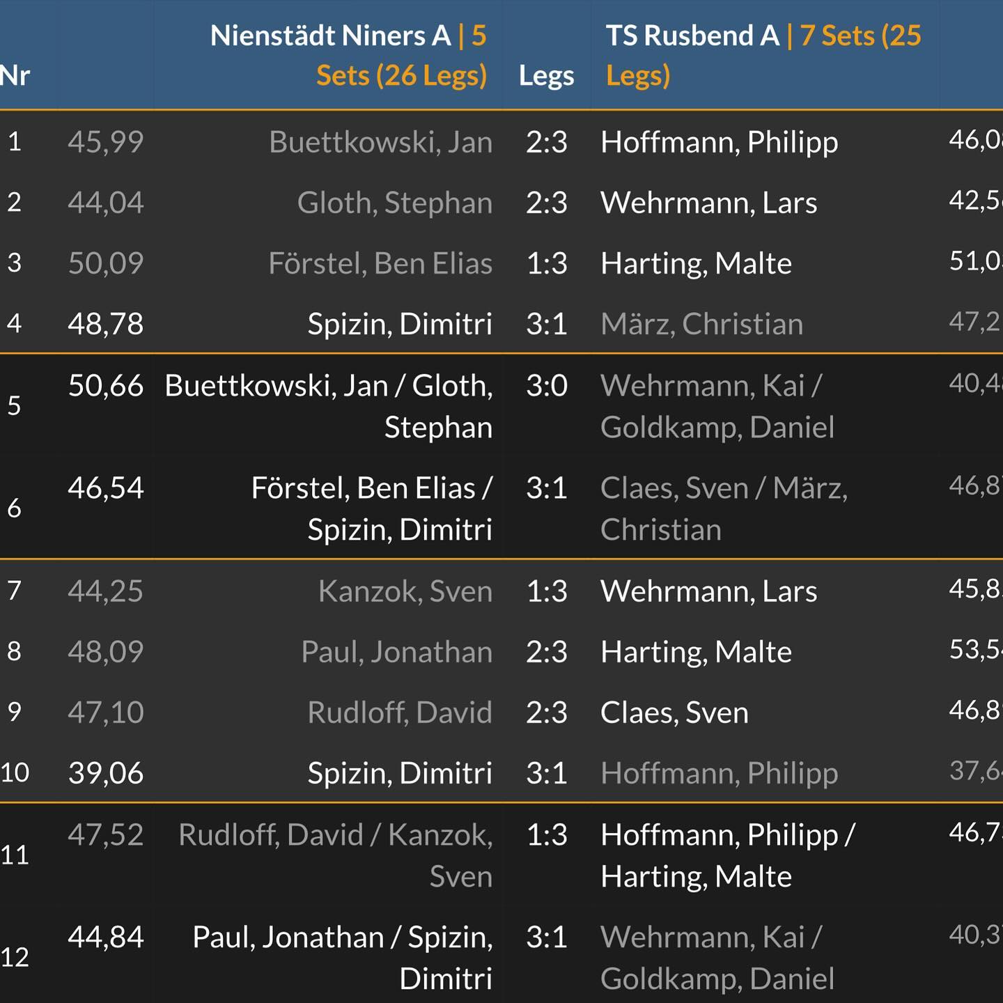 Die Dartfreunde Rusbend hingegen schwelgten im Glück. Vier Decider für sich zu entscheiden, das gleicht einem Sechser im Lotto – oder eben einem perfekten Dartabend, wie ihn die Niners am liebsten bald selbst erleben möchten.