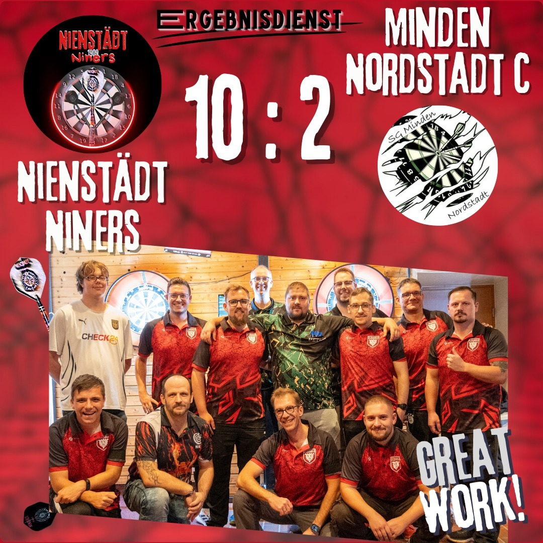 Einige Spiele schienen aufgrund der deutlichen Punkteunterschiede bereits verloren, doch durch stoische Ruhe und cleveres Ausnutzen der Chancen konnten die Niners immer wieder Legs für sich entscheiden. In einem anderen Spiel wurde heroisch gescored, aber es dauerte viele Versuche, bis die Doppel getroffen wurden. Beeindruckend waren auch einige Highfinishes und Shortlegs der Mindener, die jedoch bedauerlicherweise nicht belohnt wurden. Besonders erwähnenswert war Julian von Minden, der einen starken 18-Darter spielte.