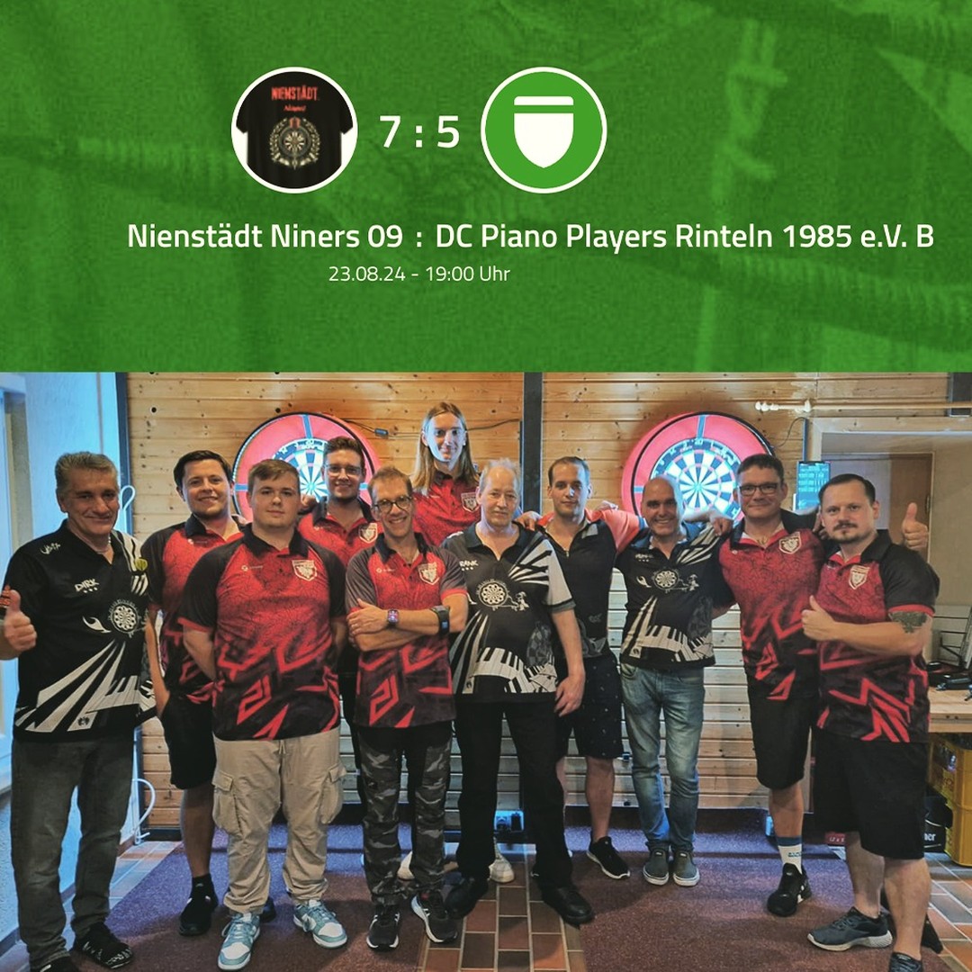 Die Dartsparte des SV Nienstädt, die Nienstädt Niners, konnte einen knappen 7:5 Sieg gegen die DC Piano Player Rinteln feiern. In einem spannenden Spiel führten die Niners zur Halbzeit bereits komfortabel mit 5:1, doch die Rintelner kämpften sich eindrucksvoll zurück. Trotz der starken Aufholjagd der Gäste bewiesen die Niners in den entscheidenden Momenten die stärkeren Nerven und sicherten sich am Ende den Sieg.